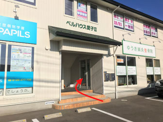 不動産ベルハウスさん隣の建物に当院があります。あすなろ学院さんと共同の入り口が見えるので右手側よりお入りください。お疲れ様でした。