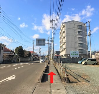 国道457号線を歩いていると、7階建てのマンションが見えてくるのでそのまま通過してください。不動産ベルハウスさんの看板までお進みください